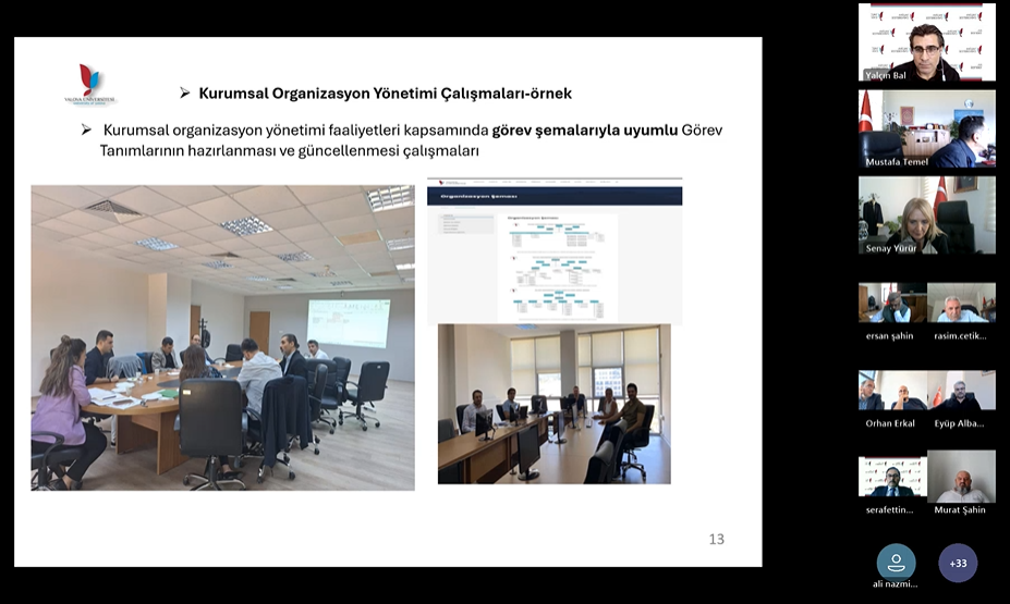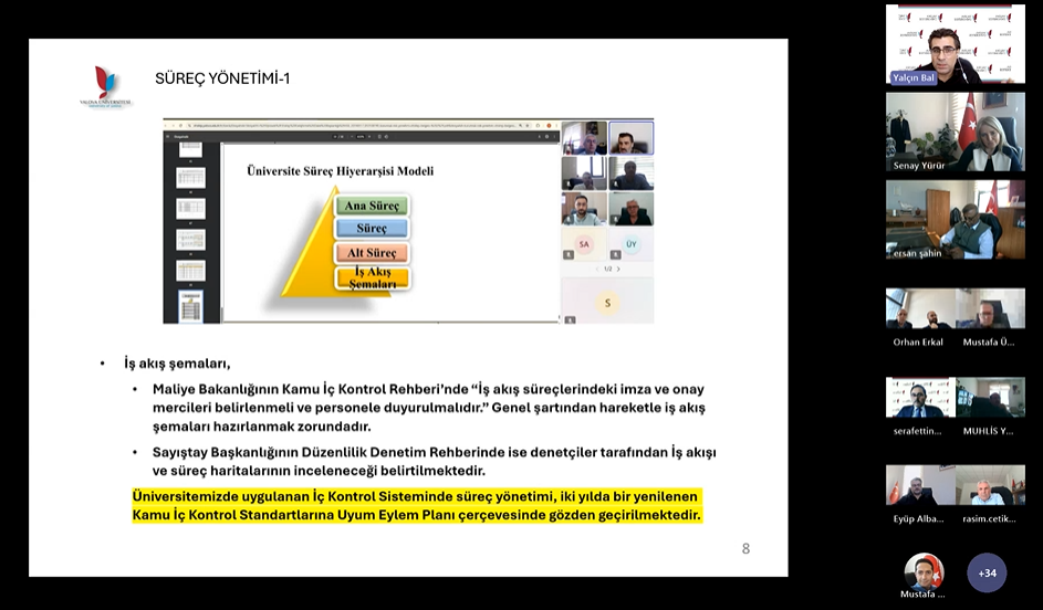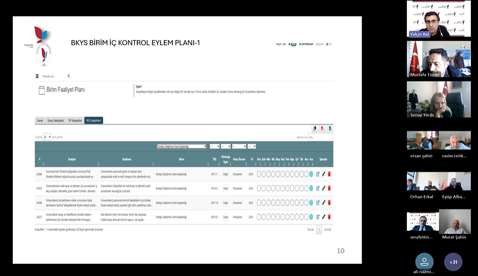 Toplantıda, Birim İç Kontrol Standartlarına Uyum Eylem Planı ile Birim Risk Eylem Planlarının, Bütünleşik Kalite Yönetim Sistemi (BKYS) üzerinden hazırlanması ve izlenmesine yönelik bilgilendirme yapıldı.